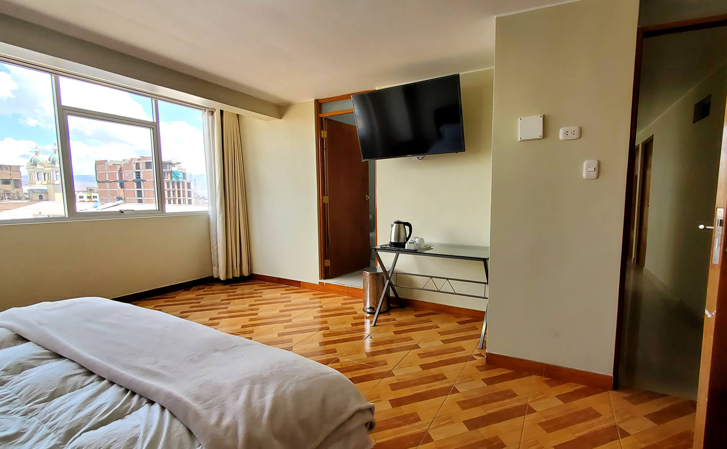 Amplia habitacion con 1 cama de 3 plazas (200 cm. * 200 cm.) Smart TV, Wifi, hervidora, incluye desayuno continental.